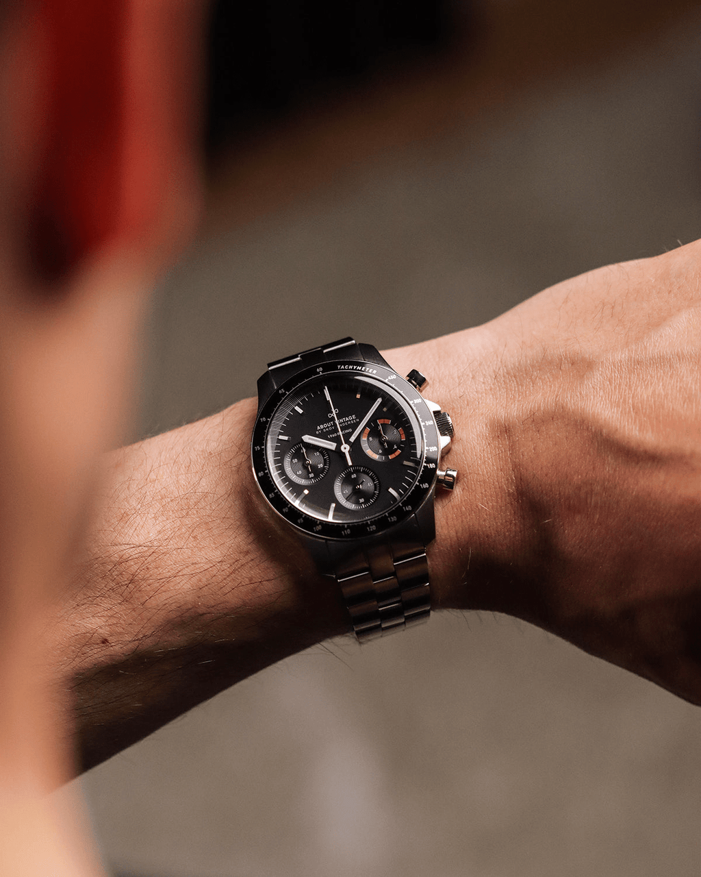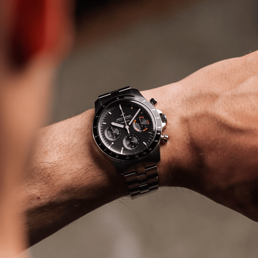 The design is a balance between vintage aesthetics, 80’s Bauhaus design lines, and modern day technology, encapsulated in a 40mm sports chronograph complete with a tachymeter, scratch resistant sapphire crystal with anti-reflective coating and 316L surgical steel case. Everything is tied together with the new About Vintage signature bracelet, featuring inwards tapering links from 20mm to 16mm as well as a butterfly clasp buckle.